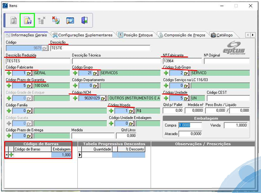 Descrição do Produto, Descrição Reduzida, Nº do Fabricante, Código do Fabricante, Código do Grupo, Código do Subgrupo, Prazo de Garantia, NCM, Código da Unidade, Moeda e Código de Barras.