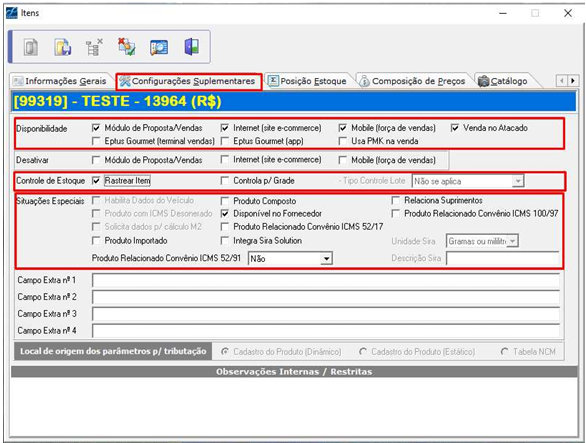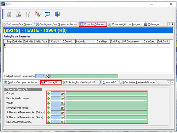 Acesse a aba Posição de Estoque → Tributação e selecione as tributações correspondentes ao item.