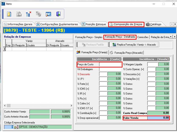 Preencha os campos Preço de Custo e Valor de Venda do item.