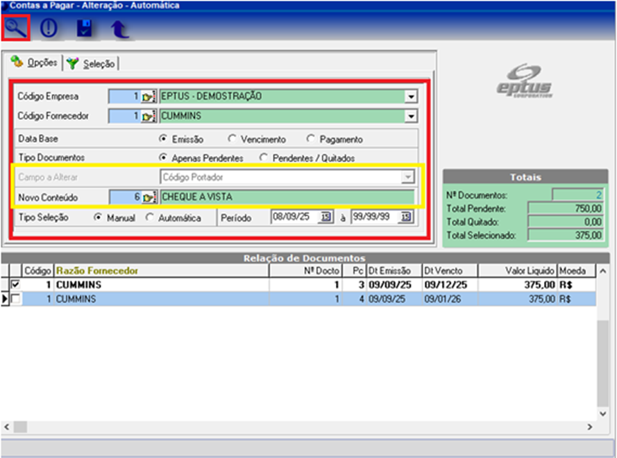 Financeiro → Contas a Pagar → Alteração → Automática.