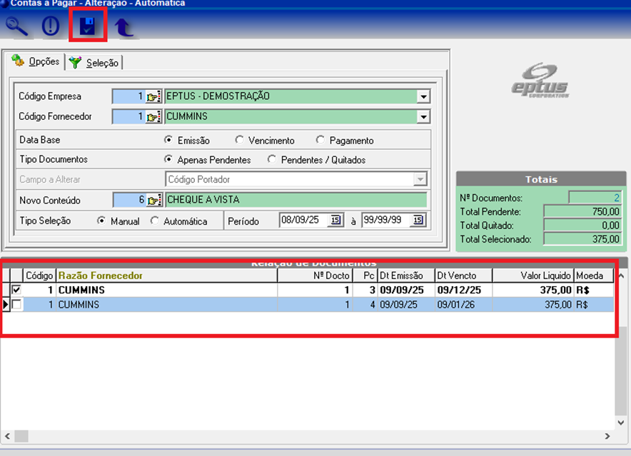 Em seguida, selecione quais documentos ou parcelas receberão a alteração. Após definir tudo, basta salvar a operação.