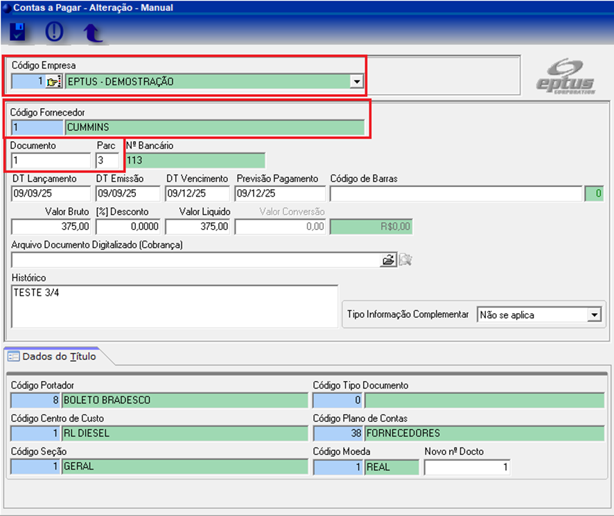 Ao abrir o módulo, vamos selecionar a empresa, o fornecedor, o documento e a parcela.