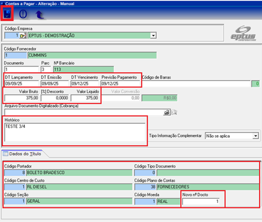 Além disso, podemos modificar o histórico, portador, centro de custo, seção, plano de contas e moeda.