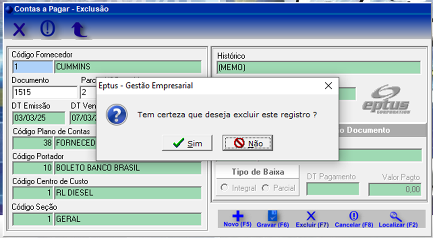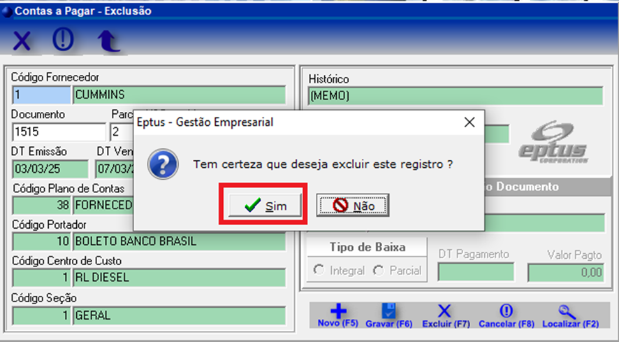 Contas a Pagar – Exclusão – Manual 1º Passo Financeiro → Contas a Pagar → Exclusão → Manual.Ao abrir o módulo, selecione o fornecedor, o documento e a parcela.Em seguida, clique em Excluir. Na tela de confirmação, clique em SIM.