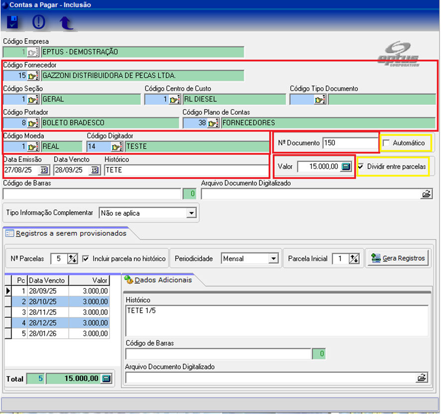 Ao abrir o módulo, precisamos preencher as informações essenciais, como: fornecedor, seção, centro de custo, portador, plano de contas, digitador e documento.