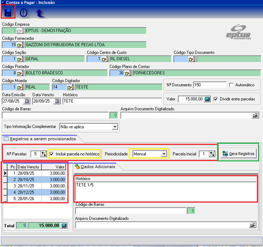 Em seguida, clique em Gerar Registro para que o sistema traga as parcelas e o histórico.